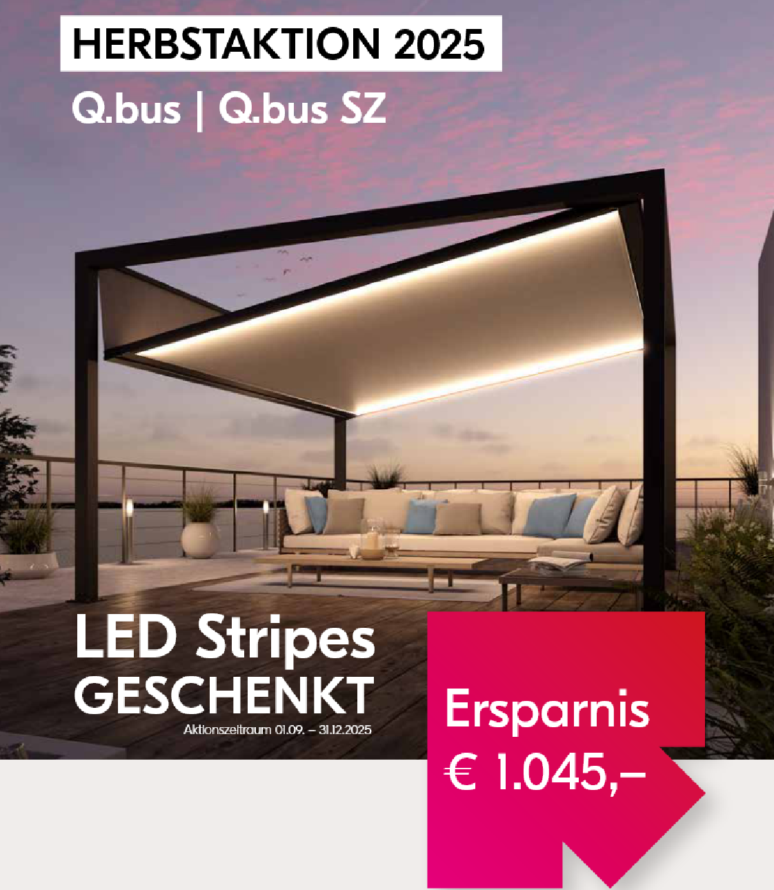 Vom 1. September bis 31.12.2025 können Sie jetzt noch von einer tollen Aktion profitieren. Die Q.bus Beschattungssysteme der Firma Leiner können sowohl tagsüber als auch nachts ihre Verwendung finden. Dazu passend gibt es stilvolle LED Stripes, die warmes, stimmungsvolles Licht auf Ihrer Terrasse zaubert. Jetzt nutzen und bis zu 1045 Euro sparen. Sprechen Sie uns gerne darauf an.