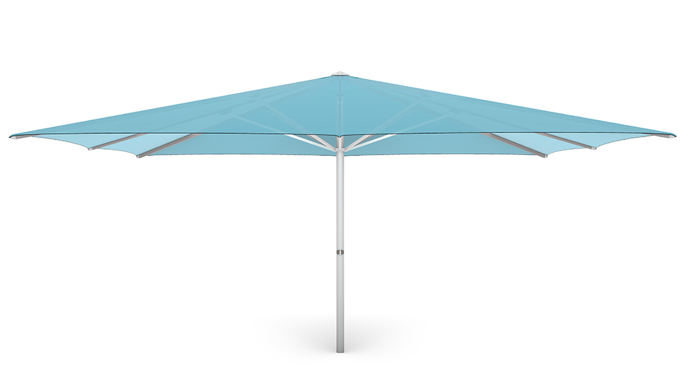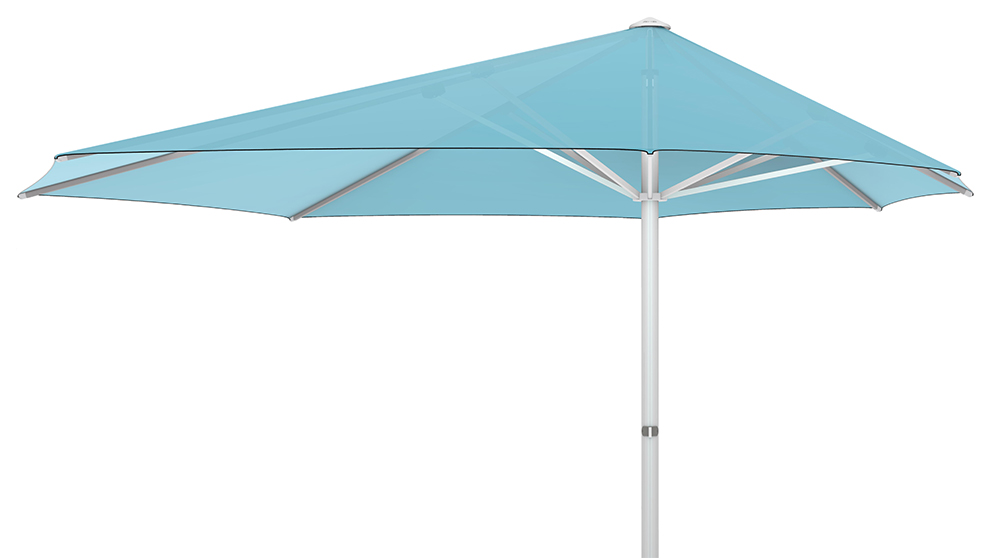 Mit dem patentierten, selbstöffnenden Kurbelsystem lässt sich der Schirm mühelos öffnen und schließen. In der exzentrischen Variante steht das Standrohr nicht im Laufweg, wodurch eine durchgängige, geschützte Fläche entsteht – ideal, um Gästen bei Sonne, Regen und Wind ein Höchstmaß an Wohlbefinden zu bieten.